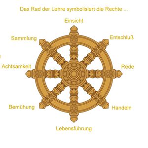 Das bekannteste Symbol im Buddhismus ist das Dharma-Rad, das „Rad der Lehre“ > Cakra. Es erinnert Buddhisten daran, dass ihr Geist die Welt nicht verlässt. Nach ihrem Glauben stirbt nur der Körper. Der Geist verändert seine Form und lebt weiter. Dieses Rad wird mit acht Speichen dargestellt, das den Achtfachen Pfad beschreibt mit